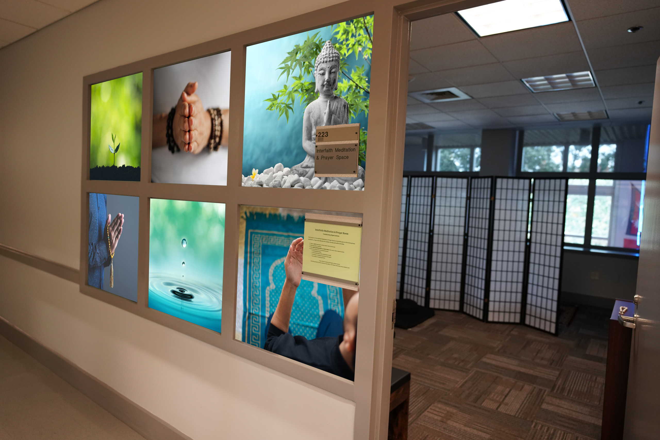 Subtle environmental cues and intentional signage were introduced to clearly identify the space while preserving privacy and calm. The design balances visibility with respect, signaling inclusion, reflection, and belonging without disrupting the surrounding circulation.
